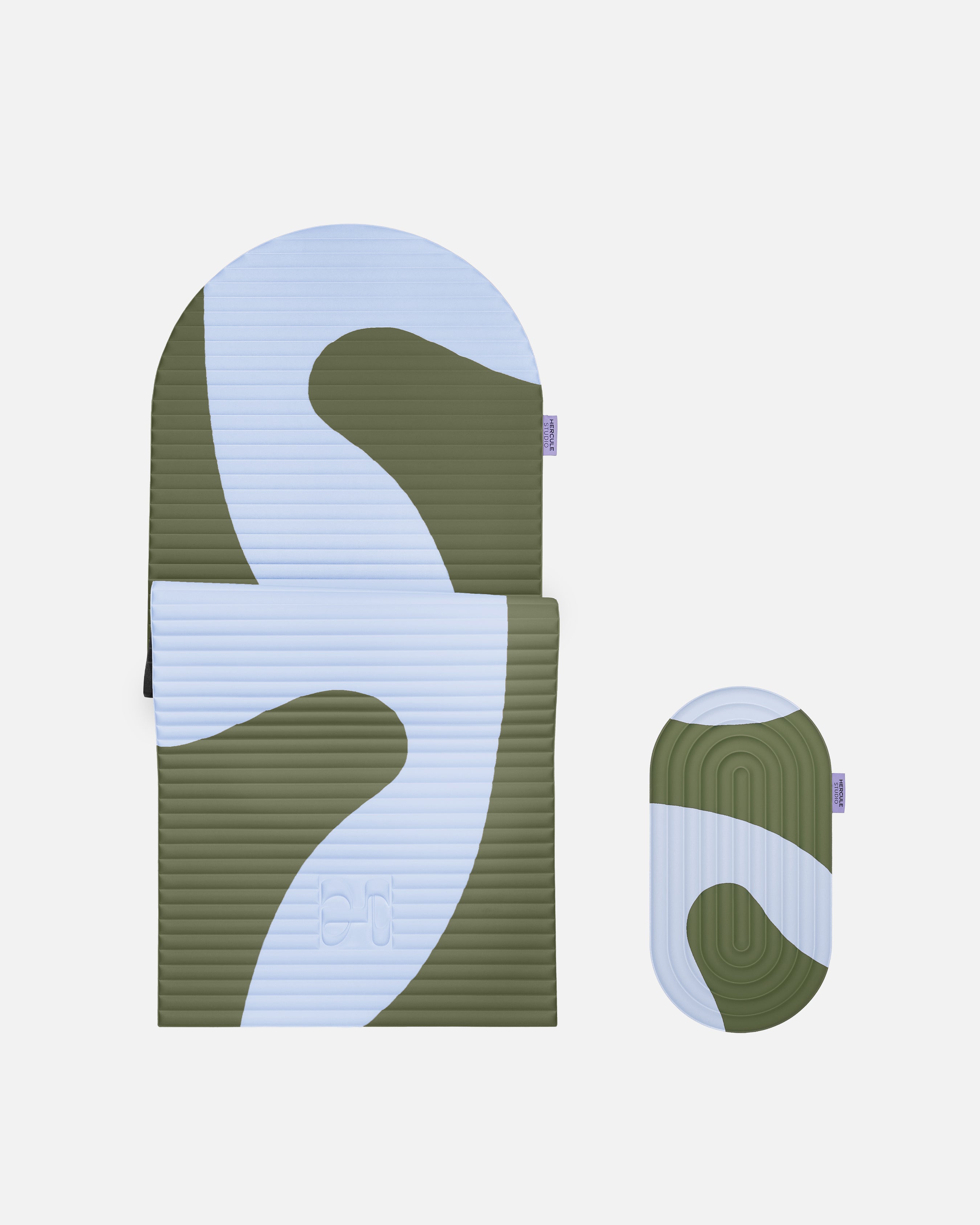 Bundle confort Hercule Studio imprimé Axel kaki bleu avec tapis Archy premium et pad Galé nomade 3-en-1, ensemble ergonomique pour pilates, yoga et Reformer, fabrication française durable, packshot