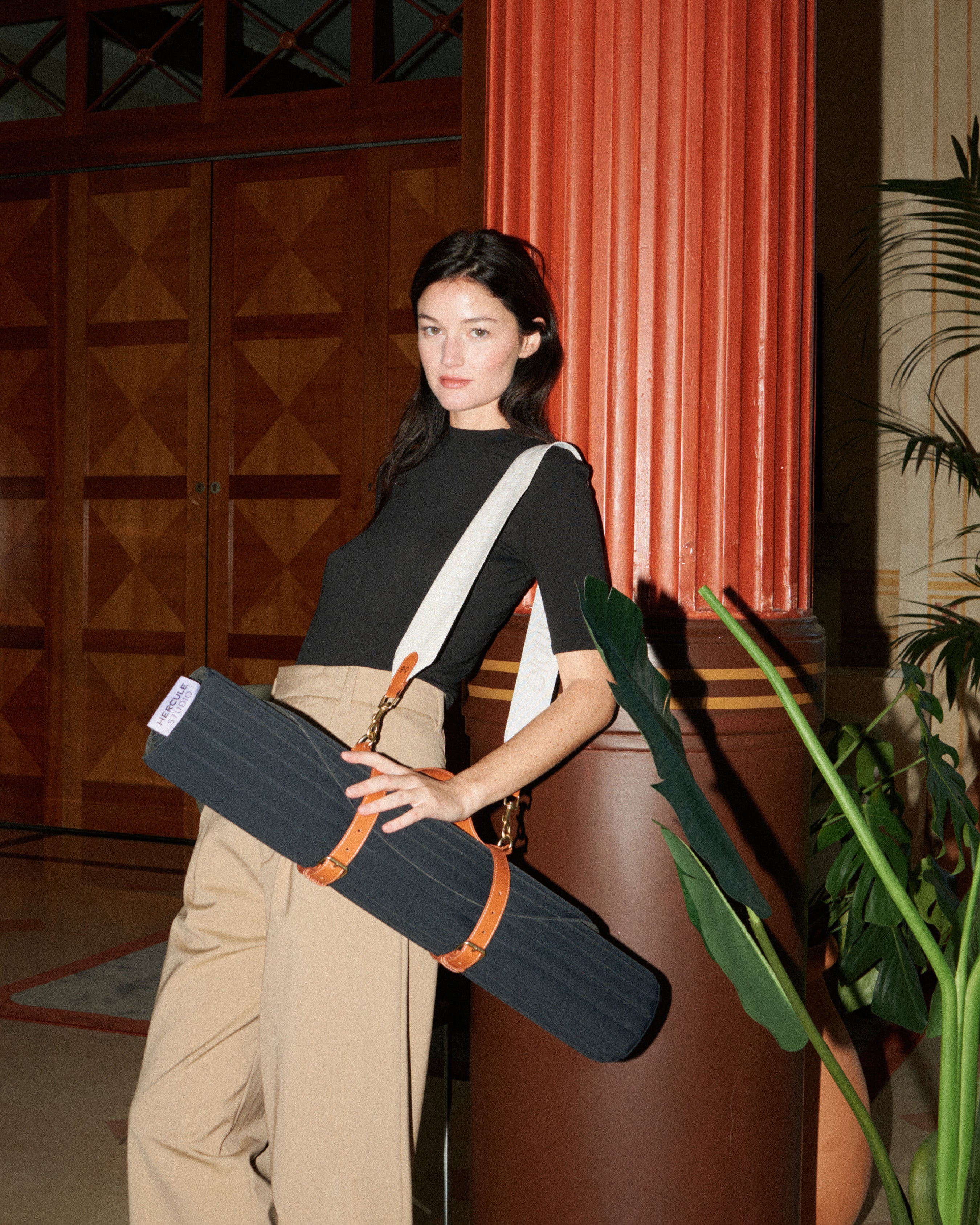 Tapis de sport couleur Outrenoir de la marque Hercule Studio avec sangle de stransport Soca en cuir végétal photo lifestyle avec mannequin