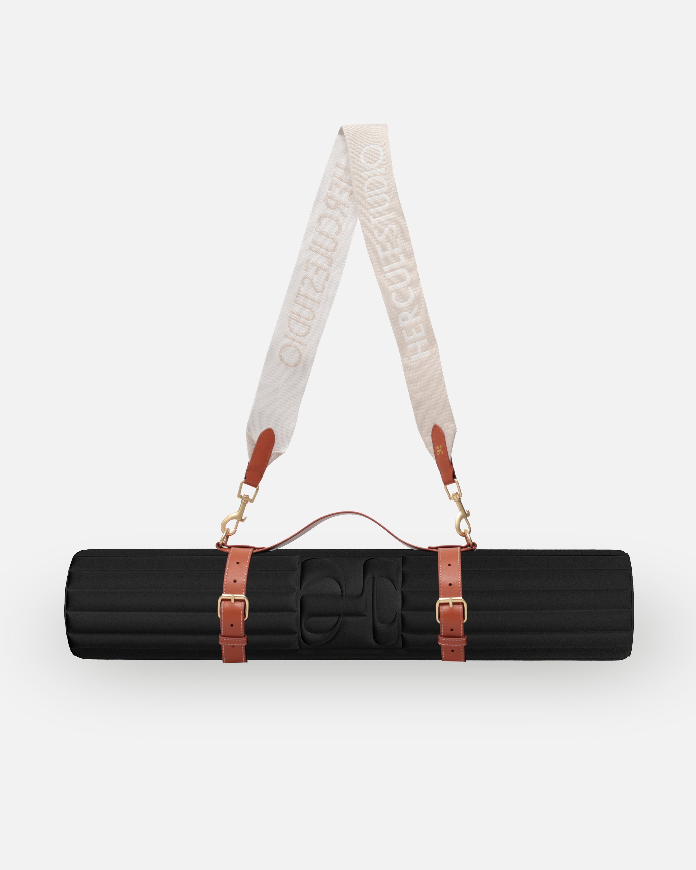 Tapis de sport couleur Outrenoir de la marque Hercule Studio avec sangle de stransport Soca en cuir végétal packshot sur fond blanc