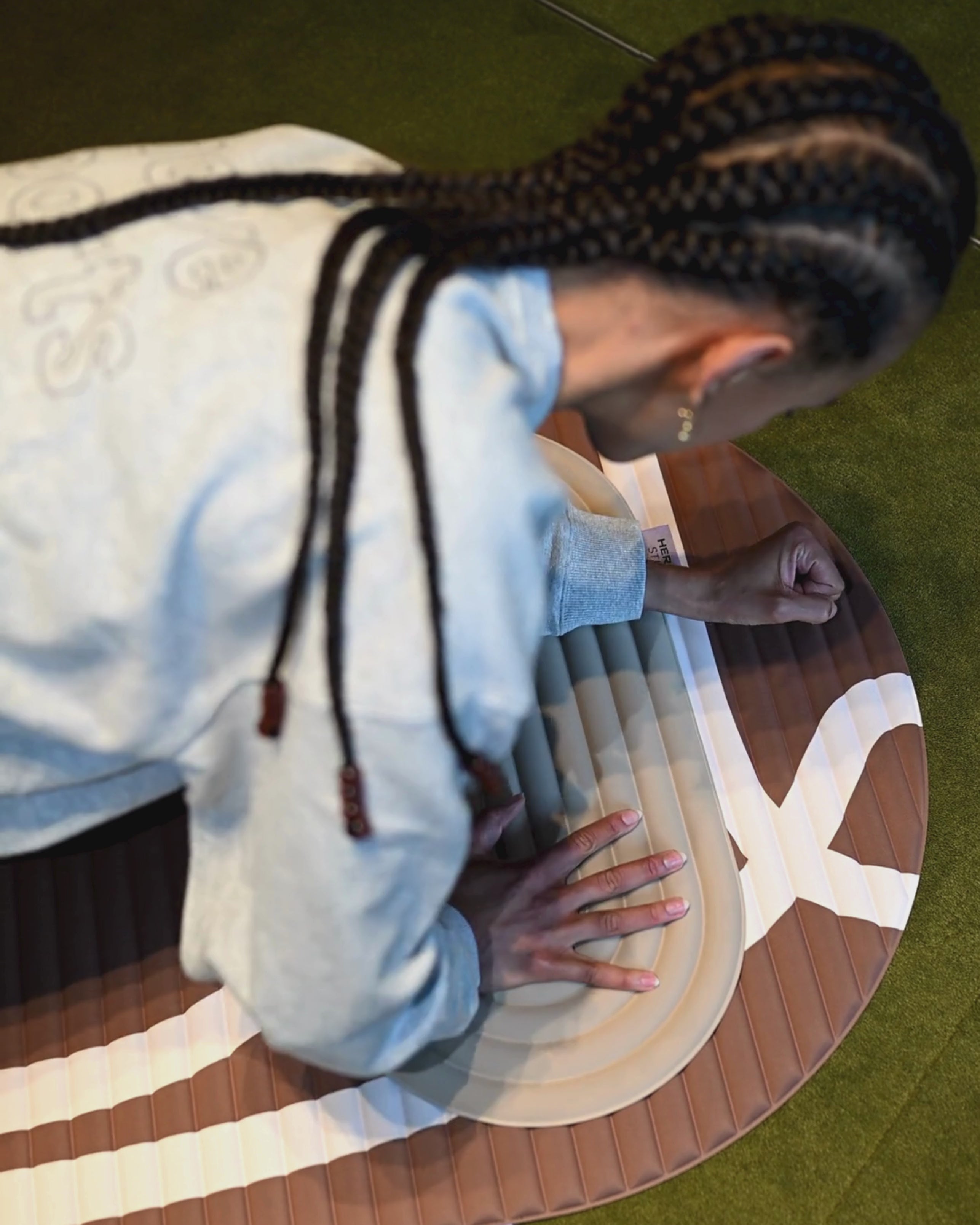Pad Galé Hercule Studio dune en situation lifestyle, mini tapis nomade 3-en-1 beige pour cours de Pilates, soutien ergonomique zones sensibles made in France