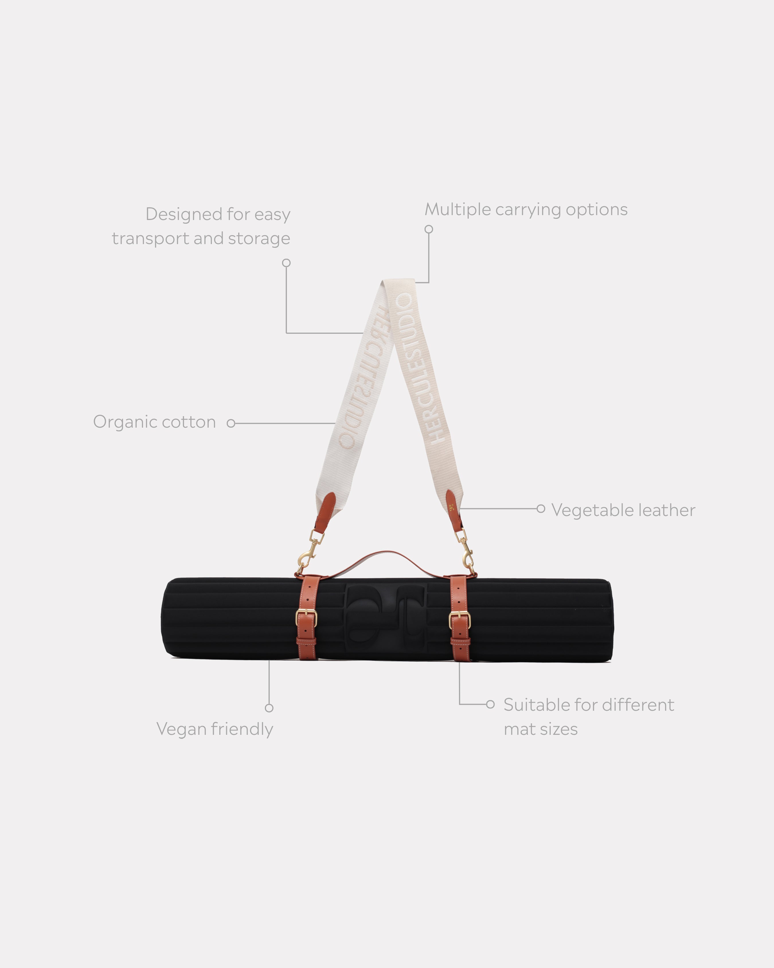 The Soca mat carrying strap is perfect for transporting your mat comfortably and elegantly. Inspired by the codes of leather goods, it combines style, practicality, and durability. It fits all mats in the Hercule Studio range and can be carried by hand, over the shoulder, or across the body.