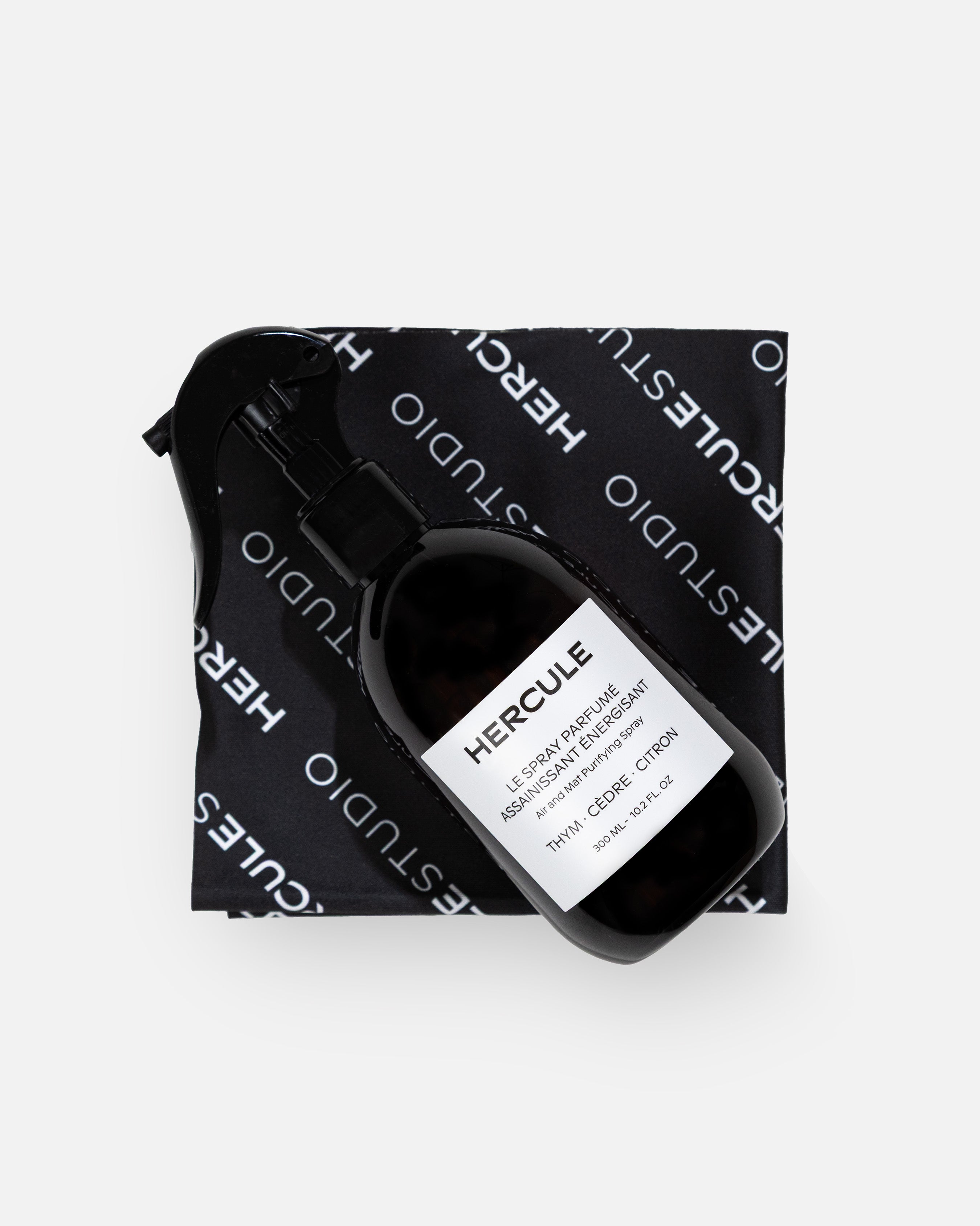 - Spray consisting of an amber trigger bottle and microfibre cloth with the Hercule Studio logo, designed to be gentle on products