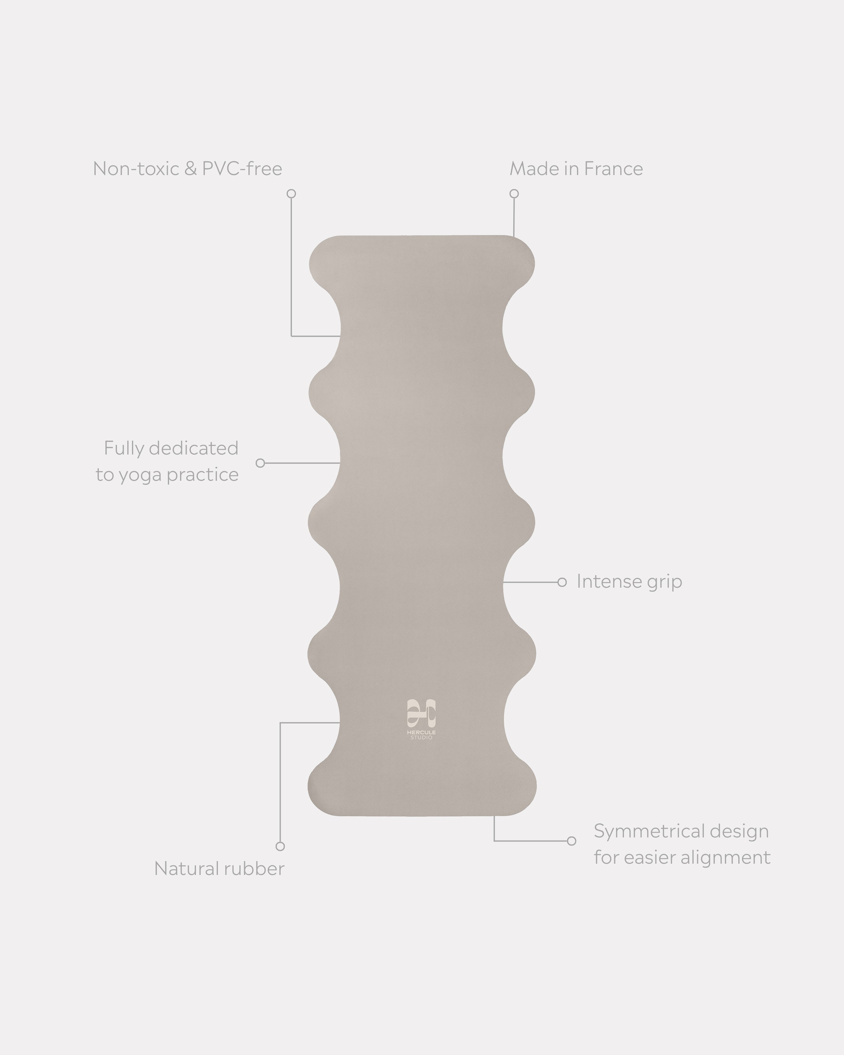 Tapis de sol pour le yoga de la marque hercule studio modèle mar couleur greige packshot déplié avec éléments de réassurance
