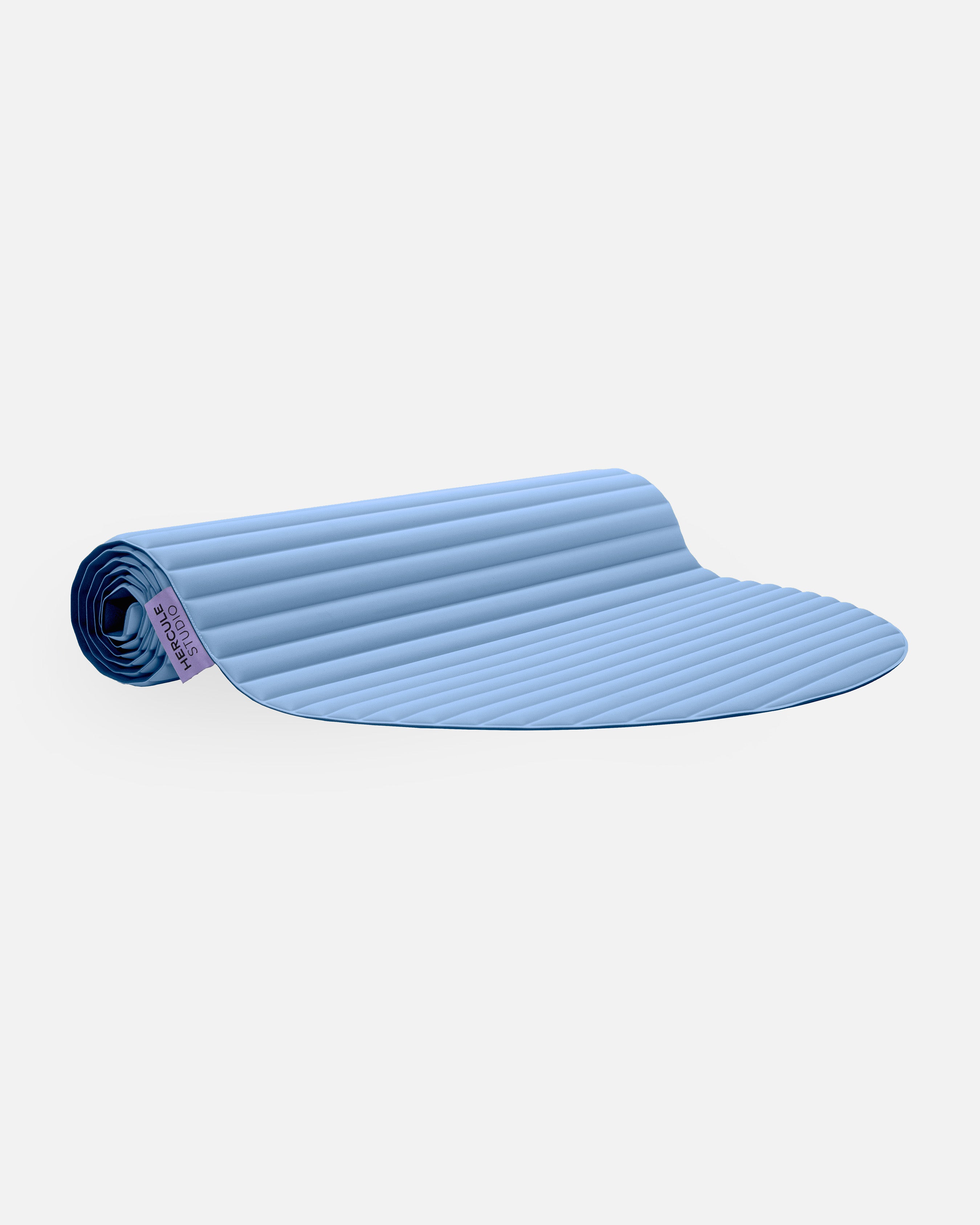 Its domed surface provides comfort and sensoriality, and its 0.8 cm thickness guarantees a firm yet welcoming hold. Its color, Blue-jean, is inspired by fashion and an iconic, universal, and timeless urban wardrobe. Blue is also a key color of the Mediterranean, associated with the sea, the sky, the wind, indeterminate spaces, the horizon, and transparency. The blue follows the curves and reliefs of the Archy fitness mat to make it welcoming, soothing, and soft. Its gray undertone gives it a neutral yet incisive, timeless yet futuristic, trendy, and resolutely contemporary feel.